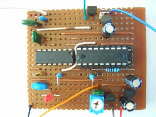 Not pretty, but the test setup uses a breadboard with the PIC16F628A, LEDs for checking operation and a loudspeaker for monitoring the tones.