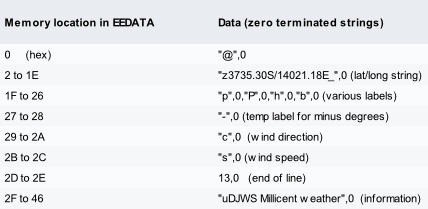 The latitude and longitude are stored in EEDATA and can readily be changed at programming time. You’ll have to do some arithmetic in changing the ascii value of a letter/numeral to hex – still it’s good for the soul and few people change QTH that often. I’ve provided a table of values later in this document.