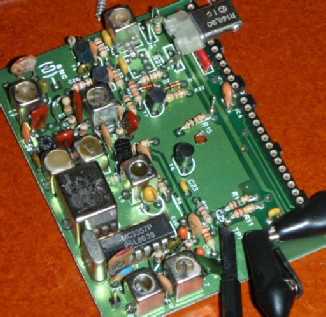 The receiver/logic board is removed from the Weathalert and the logic section cut off with a hacksaw. I chose to remove the large ICs at the bottom (HY6116 and 27C64) and cut through the sockets leaving the bottom row intact. This had minimum disruption to the traces and left the receiver intact. The receiver is a sensitive. crystal controlled receiver for 2metres (148.0875 MHz to be exact). The original crystal is on 68.69375MHz. (2*68.69375 + 10 .70 = 148.0875).
