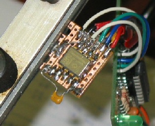 Right: is the circuit board of the SCA61T inclinometer chip. See below for details on how this may best be mounted. The photo shows it in a test jig.