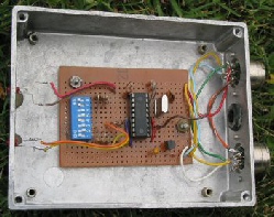 A view of the interface board installed in a second hand diecast box that happened to have to one 5 pin and one 8 DIN connectors already installed.